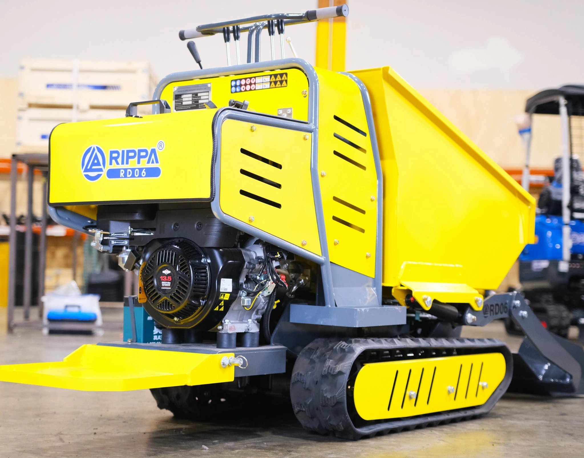 Because of its high-performance engine and robust hydraulic drive, the RD06 moves quickly even under load. The 13.4 HP Briggs & Stratton powerplant provides strong torque at 3600 rpm, and the heavy-duty tracks distribute weight so the machine doesn’t sink or slip. In practice, operators can save considerable time: the RD06 can automatically load itself with the push of its hydraulic shovel and then dump the load with a lever, far faster than shoveling by hand. Its 30% gradeability means it can climb hills and ramps with a heavy bucket, and the tracked drive is far more stable on uneven ground than a wheeled dumper.